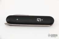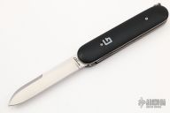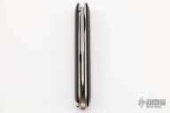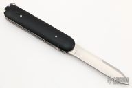This Switch Army Switchblade by Chuck Gedraitis features a satin finished blade with false top edge. The handle has black G-10 scales, satin finished titanium liners, backspacer with lanyard hole. Has tweezers and toothpick like a Swiss Army Knife. Nice action, lockup and blade seating. Excellent condition.