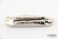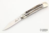 This leverlock auto by Hubertus features a mirror polished blade, nickel silver double bolsters, stag scales, nickel silver liners and brass pins. Opens with a nice snap. Very fast opening. Comes with original box. New condition.
