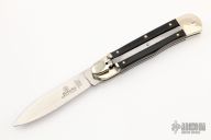 This leverlock auto by Hubertus features a mirror polished blade, nickel silver double bolsters, ebony scales, nickel silver liners and brass pins. Opens with a nice snap. Very fast opening. Comes with original box. New condition.