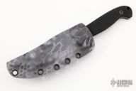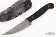 This Phantom by Frank Landau III features an acid washed blade with false top edge and notched thumbrest, .145" blade stock and 1.160" blade depth, full tang construction. The handle has textured black G-10 scales with black screws. Comes with a C4 Industries kydex sheath with clip. Excellent condition.