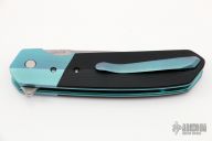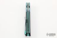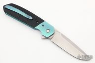 This 4F Flipper by Richard Rogers features a fine bead blasted drop point blade with swedge and flipper. The handle is comprised of milled and anodized titanium bolsters with black G-10 scales over anodized titanium liners with matching tip up clip with hidden screws. Rides on bearings, nice detent, lockup and blade seating. Excellent condition. Comes with a zippered case and a Reissued COA.