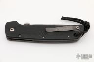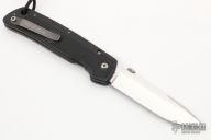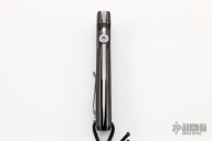 This ATCF linerlock folder by Bob Terzuola features a tumble finished spear point blade with notched thumbrest and thumbdisc. The handle has injection molded carbon fiber scales, bead blasted titanium liners and tip up bead blasted titanium clip. Nice detent, blade seating and lockup. Has some light scuffs and scratches, has been resharpened very well, otherwise good condition.