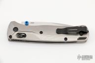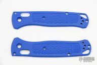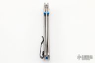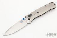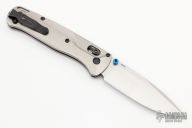 The Benchmade Custom Bugout features a drop point blade with a stonewashed finish. It's a manual opener with ambidextrous thumb studs. This AXIS lock has blue handles with black hardware, a mini deep-carry pocket clip, and a lanyard hole. Comes with a soft pouch and original box. Has Titanium crossfade scales from Flytanium. Excellent condition.