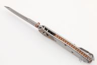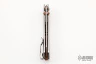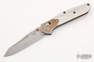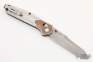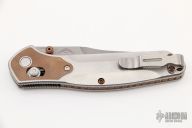 The Warren Osborne designed Benchmade 940 is a popular knife for good reason. It's a comfortable everyday carry knife with its slim design, great ergonomics and lightweight. The 940-1 has a premium CPM-S90V steel blade with a plain edge and a stonewashed finish. The handle has custom Death Grip titanium scales with copper inlaid bolsters, stainless steel liners, copper backspacer. The AXIS lock makes the knife usable for right and left-handers. Comes with original box, carbon fiber scales and papers. Excellent condition.