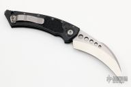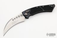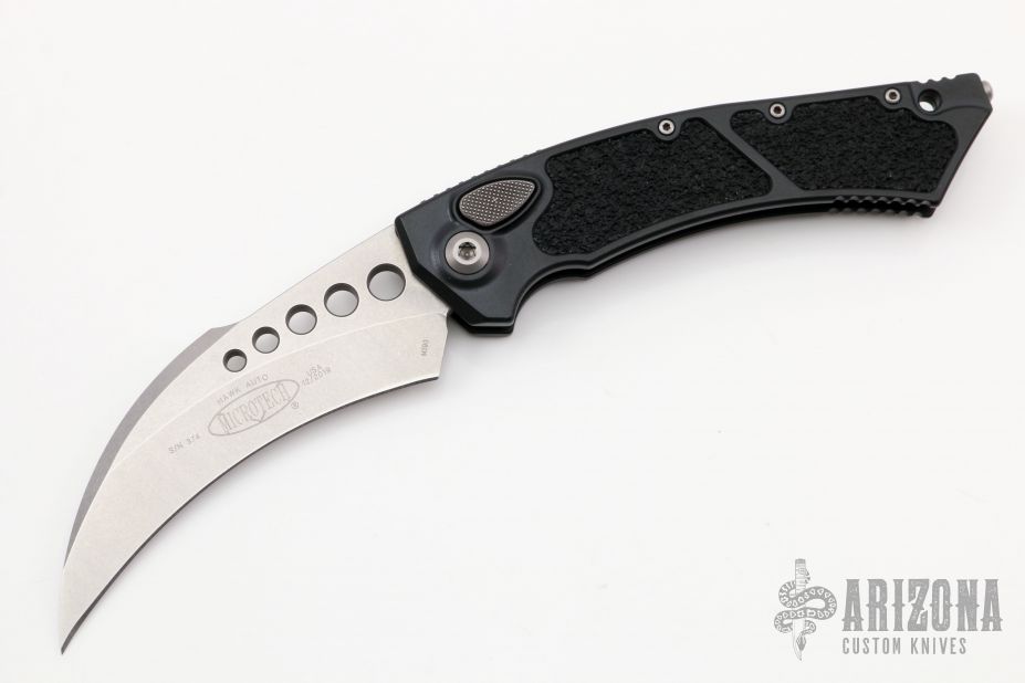 This Hawk Auto by Microtech Knives features a stonewashed hawkbill blade. The handle has a black aluminum frame with blasted stainless steel hardware and tip up clip. Dated 12/2019 and s/n 374. Includes the original box and papers.   Excellent Condition.