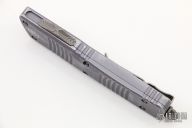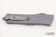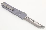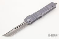 This Combat Troodon OTF automatic by Microtech knives features an Apocalyptic Hellhound tanto blade, and a distressed gray aluminum handle with bead blasted hardware, tip down carry. Glass breaker. Dated 03/2019. Comes with original box and papers. Excellent condition.