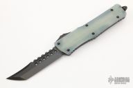 This Combat Troodon by Microtech Knives features a tumbled DLC Hellhound blade with false top edge. The handle has a black aluminum frame with a jade G-10 top, tip down black stainless steel clip black hardware. Comes with original box and papers. 08/2021 and S/N 055. Excellent condition.