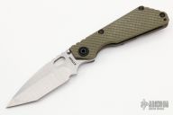 This SNG framelock folder by Mick Strider features a stonewashed tanto blade and a dimple pattern green G-10 and flamed titanium frame and tip up titanium clip. Includes a "Lock Bar Stabilizer" for maximum reverse lock retention. Nice detent, lockup and blade seating. New Condition.