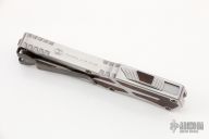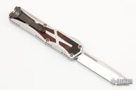 This Colossus by Heretic Knives features a mirror polished tanto blade with fullers. The handle has a satin finished stainless steel frame with seamless desert ironwood inlays, stainless steel thumb slide with desert ironwood inlay, stainless steel tip down clip. Comes with original box, zippered case and COA dated 3/22 and s/n 020. Excellent condition.