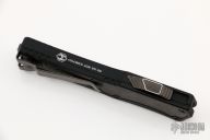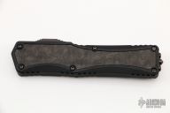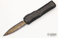 This Colossus by Heretic Knives features a hand ground Baker Forge Damascus double edged blade. The handle has a black aluminum frame with Black Dunes Fat Carbon inlays, DLC stainless steel thumb slide with Black Dunes Fat Carbon inlay, stainless steel tip down clip. Comes with original box, zippered case and COA dated 5/22 and s/n 035. Excellent condition.