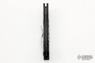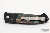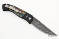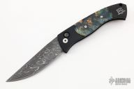 This AIK Custom Brend automatic by Pro-Tech features a Doug Ponzio Damascus blade. Black aluminum handle with custom mammoth tooth inlays done by Adams International Knifeworks, and a satin finished stainless steel clip, tip up carry. Push button has mammoth tooth inlay. Strong coil spring opening, perfect lock up and blade seating. Comes with original box and papers. Excellent condition.