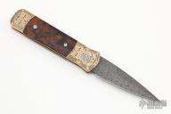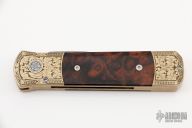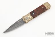 This Godson Ultimate Custom by Protech features a Vegas Forge Spirograph Damascus blade.  The handle features a bronze aluminum frame with Bottega Incisioni engraved bolsters, desert ironwood scales and a mosaic push button.  Includes original box and papers. New condition.