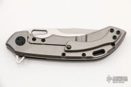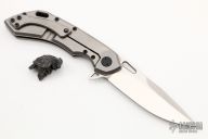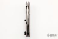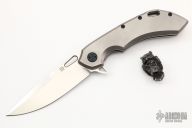 This Wayfarer 247 from Olamic Cutlery features a satin finished blade with swedge, thumbhole, notched thumb rest and flipper. The titanium handle scales are bead blast finished titanium with a matching pocket clip is positioned for tip up carry with a ceramic ball inlay, floating titanium backspacer. The Wayfarer 247 is very comfortable in the hand and flips well with no wrist action needed. Blade is centered when closed and locks up with no play. Comes with zippered case and maker's card with a serial number of T1539 and dated 6-17-21. Excellent condition.
