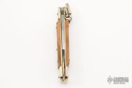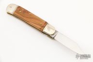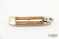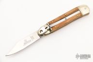 This leverlock auto by Hubertus features a mirror polished blade, nickel silver double bolsters, olivewood scales, brass liners and brass pins. Opens with a nice snap. Very fast opening. Has a few light scratches, otherwise excellent condition.