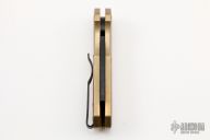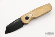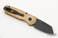 This Runt by Pro-Tech features a black blade.  The handle features a stonewashed bronze aluminum frame with milled thumbrest, a stainless steel tip up pocket clip and a mother-of-pearl push button.  Comes with original box and papers. Excellent condition.