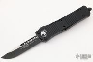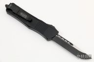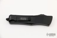 This Troodon OTF automatic from Microtech features a black blade with fullers. The handle has a black aluminum frame with thumb-slide and glass break, and tip down clip, all black hardware. Comes with a original box and papers. Dated 04/2022 with a S/N of 9908. Has a couple light scuffs, otherwise excellent condition.