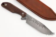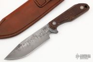 This Fateralus by Jason Stout features a clip point blade with nice hamon and false top edge, .184" blade stock and 1.427" blade depth, full tang construction. The handle has brown burlap micarta scales with lanyard hole. Comes with a brown leather sheath and COA. Excellent condition.