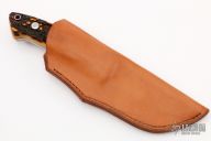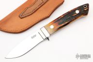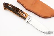 This Loveless Style Drop Point by Mitch Jenkins features a mirror polished blade, mirror polished 416 stainless steel fittings, and amber stag scales with red liners, .189" blade thickness and 1.036" blade depth, full tapered tang. Excellent fit and finish. Comes with brown leather sheath. Has a couple light scuffs otherwise excellent condition.