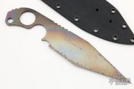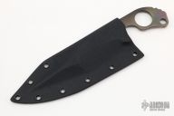 This XL SLCC by Mick Strider features a chisel ground Strike Plate Titanium blade with a notched thumbrest, .214" blade stock and 1.752" blade depth. The handle has a finger groove and ring. Comes with a kydex sheath. New condition.