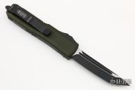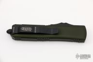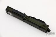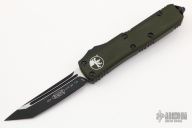 This UTX-85 by Microtech features a black tanto blade with satin flats and fullers. The handle has a green aluminum frame with all black hardware and tip down clip. S/N 10855 and dated 02/2018. Comes with original box and papers. Excellent condition.
