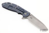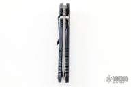 This XM-24 by Rick Hinderer features a working finished blade with notched thumbrest and flipper. The handle has an anodize finish titanium frame, black G-10 scale, titanium barrel spacers, and a tip up or down reversible titanium clip and filler tab, lanyard hole at the butt. Excellent condition. Comes with original box.