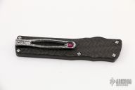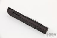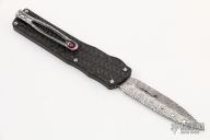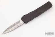 This Small Twist Tighe OTF by Brian Tighe features a Damasteel double edged blade. The handle has a milled and DLC coated titanium front, carbonfiber back, tip down DarkTi clip with ruby ball insert, has ruby ball insert in the butt as a glass breaker, has a carbon fiber thumb slide. Comes with a zippered case. Excellent condition.