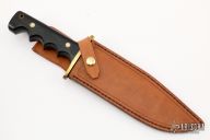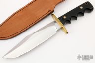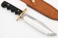 This Humpback Fighter by Steve Voorhies features a mirror polished clip point blade with a sharpened top edge, .222" blade stock and 1.820" blade depth, full tang construction. The handle has a brass guard, black linen micarta grip, lanyard hole in the butt. Comes with a brown leather sheath. Has a few light scratches, otherwise excellent condition.