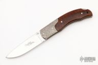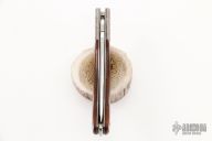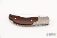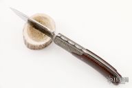 This knife features a mirror finished blade with fileworked spine. The handle has textured nickel silver bolsters, snakewood scales over steel liners and fileworked backspacer. Excellent condition.