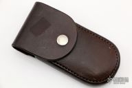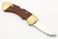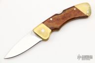 This knife by Track Knives features a mirror polished blade. The handle has dovetailed brass bolsters, dymondwood scales, brass liners and a steel backspacer. Comes with a brown leather sheath. Has some light scratches, otherwise excellent condition. #120