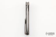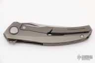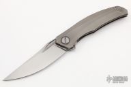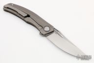 This Quantum by Shirogorov features a blasted blade with notched thumbrest and flipper. The handle has a blasted and milled titanium frame, backspacer, tip up titanium clip with hidden screws. Rides on MRBS, nice detent, lockup and blade seating. Comes with original COA. Has a couple light scuffs, otherwise excellent condition.