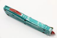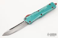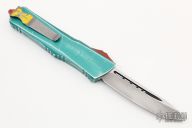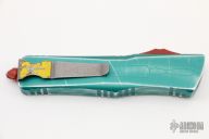 This Combat Troodon by Microtech features an Apocalyptic finished tanto blade. The handle has a distressed green aluminum frame with red hardware and a tip down stainless steel clip. Dated 10/2020 and s/n 922. Has some light scuffs, otherwise excellent condition.