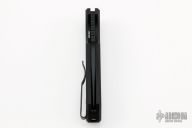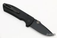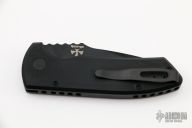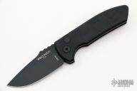 The Short Bladed Rockeye, or SBR for short, is a compact version of the outstanding full sized Rockeye Auto. Both knives are designed by Marine Corps knife designer Les George, who’s ergonomic hard use knives have been faithfully translated to automatic versions by Pro-Tech. The SBR features a compact design, with a 2.5″ blade that’s built for a multitude of cutting tasks. A pocket milled spine adds extra grip and depth to the design. The SBR features solid black hard coat anodized handles, blasted hardware, black DLC coated deep carry clip, and a black blade. Excellent condition.