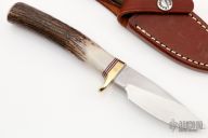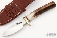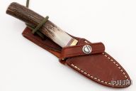 The Model 11 is the original drop point blade. Designed by Tommy Thompson, noted Alaskan guide, in 1952 for big-game skinning, with point dropped below top of blade to prevent cutting too deeply through skins when used point first. The blade is satin finished with a notched thumbrest, .150" blade stock and 1.078" blade depth, hidden tang construction. The handle has a brass guard, stag handle, red/white/blue spacers. Comes brown leather sheath with belt loop. Excellent Condition.