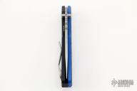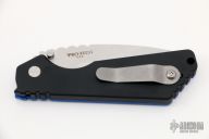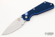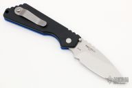 This Pro-Strider PT by Pro-Tech and Strider Knives features a stonewashed 154CM blade with a notched thumbrest. The handle has a textured blue/black g10 scale, a and black aluminum frame with stonewashed stainless steel tip up clip. Comes with original box and papers. Excellent condition.