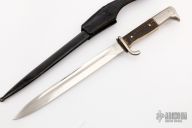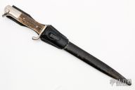 This WWII German Dress Bayonet comes with original sheath and frog, which is rare to find. The blade is not sharpened. Has some scratches and wear, otherwise good condition for its age. This one has stag scales that are pinned in place with hand peened nickel silver pins. This was likely done by whoever it was issued to. Has a little epoxy on one of the scales. Please let us know if you know who the manufacturer of this knife is. The mark is of a scale with ACS.