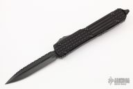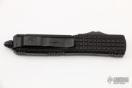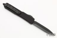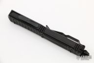 This Ultratech OTF automatic by Microtech features a D/E black DLC fluted blade. Black aluminum frag pattern frame with black tip down stainless steel clip. Dated 10/2021 and s/n 142. Excellent condition. Includes original box and papers.