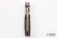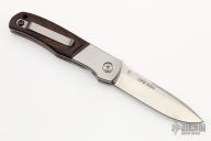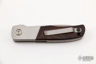 This TTF-3A from Bob Terzuola features a stonewashed, CPM S30V blade with swedge and a single thumbstud for ease of opening. The handle has titanium bolsters, titanium liners and ironwood scales.  The pocket clip is titanium and is positioned for tip up carry.  Copper backspacer. Blade is centered when closed and locks up with no movement. This piece is in excellent condition, shows light signs of carry on clip and bolsters.