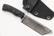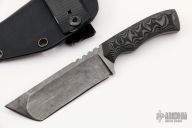 This Tanto by Nicholl Knives features an acid stonewash finished tanto blade with notched thumbrest, .188" blade stock and .990" blade depth, full tang construction. The handle has sculpted black/grey G-10 scales. Comes with a kydex sheath with leather IWB loop. Has some sheath marks, otherwise excellent condition.
