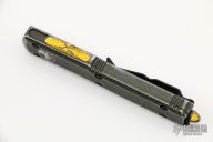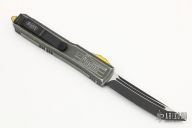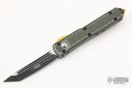 This Ultratech OTF automatic by Microtech features a T/E black tanto blade. Distressed OD Green aluminum contoured frame with black hardware, yellow thumbslide and glass breaker. Dated 08/2020 and s/n 27. Excellent condition. Comes with original box and papers.