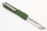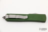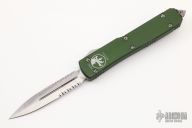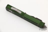 This Ultratech OTF automatic by Microtech features a D/E dagger blade with a partially serrated edge. Green aluminum frame with black hardware and tip down stainless steel clip. Dated 02/2015 and s/n 52267. Includes original box and papers. Has some marks on the blade otherwise, excellent condition.