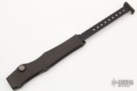 This HALO III is the tanto blade model in the HALO series by Microtech Knives. Single action, side positioned button for firing. Closure via a reverse charging handle in the rear of the frame. Contoured frame grip with milled ribbing on the frame spine and belly. This Halo III has a black tanto partially serrated blade. Dated 11/99 and S/N 0201. Has some scuffs, otherwise excellent condition.