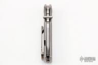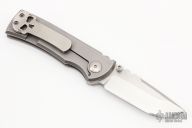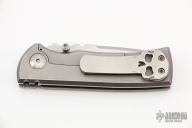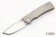 This Chaves American Made Knives Redencion 228 is a framelock folder based on the popular Redencion custom knife made by Ramon Chaves. This piece features a tumbled blade with notched thumbrest and dual thumbstuds. The handle is comprised of bead blasted titanium scales over titanium barrel spacers. Matching signature "Chaves Skull" tip up clip. Lanyard pin in pommel. Comes with a zippered case. Has scuffs and scratches, and has been resharpened. Great condition.