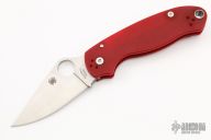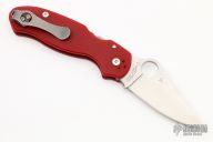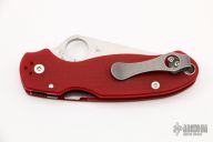 This Para 3 by Spyderco features a satin finished clip point blade with thumb hole and notched thumbrest. The handle has red G-10 scales over nested steel liners and stand-offs. The steel pocket clip is 4 way adjustable. Includes original box and papers. Has a couple of light scratches, otherwise excellent condition. DLT Trading Exclusive.
