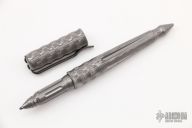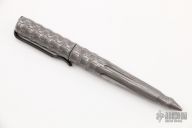 Benchmade has really pushed the boundaries of tactical pens with this heavy duty tactical pen - the 1100 series in all stainless damasteel by Damasteel of Sweden. This pen features a snap on/off cap, ergonomic machined knurling on the pen and cap and a durable Fischer Space Pen ink cartridge. Fischer Space pen ink cartridges are designed to write at any angle, at extreme temperatures and under zero gravity. The pen has a pocket clip that is securely mounted on the top of the cap. Excellent condition in original box with papers.