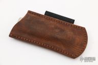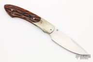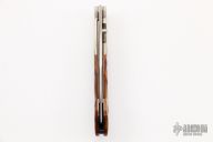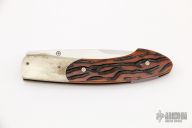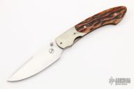 This B-12 by William Henry features a hand rub satin finished blade with single thumbstud. The handle has nickel silver bolsters, jigged bone scales, anodized titanium liners and backspacer.  Includes a brown leather slip sheath. Excellent condition.