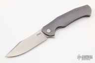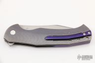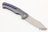This Mantis 6 Flipper by Herman Knives features a tumbled blade with flipper. The handle has a milled and anodized titanium frame, titanium liner, and tip up anodized titanium clip and backspacer. Nice detent, lockup and blade seating. Rides on bearings. Excellent condition. Comes with zippered case and COA dated 2-6-22.