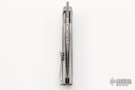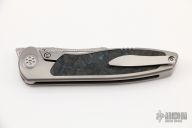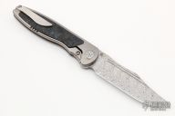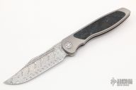 This Mini Tempest from Brian Nadeau features a Damasteel bowie blade with a fuller and notched thumbrest/front flipper. The handle has a bead blasted titanium frame with Blue  Dark Matter FatCarbon inlays, satin titanium tip up clip. Nice detent, lockup and blade seating, stainless lockface insert. Includes original box. New condition.