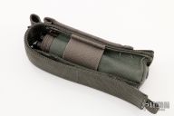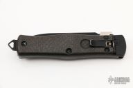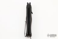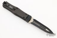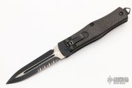 This Cobra lever lock automatic by Microtech Knives has a black/satin finished partially serrated blade with a false top edge. The handle has black titanium bolsters, Lightning Strike carbon fiber scales, black stainless steel liners and a black stainless steel tip up clip. Black tactical finish on all hardware. Serial number 037 and dated 05/2012. Comes with original sheath, box and papers. Has some scuffs and scratches, otherwise excellent condition.