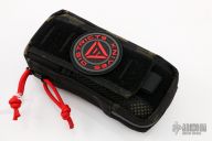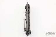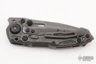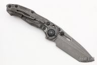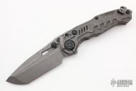 This Frame lock Flipper by District 9 has a stonewashed M390 drop point blade with dual thumb studs, flipper, and filed thumb rest. Handle is stonewashed titanium with stainless steel lock bar insert, manual lock safe system (preventing the lock bar from sliding to the open position, making this knife a virtual fixed blade), stonewashed titanium backspacer and tip up clip, and lanyard hole. This is an impressive piece with superb ergonomics and mechanics. Very nice work. Excellent condition. Comes with zippered case and extra hardware.