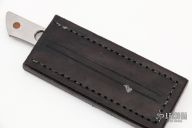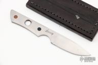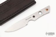 This small fixed blade features a satin finished drop point blade with an integral construction. The handle features large copper pins. Includes a black leather sheath. Heavy scuffs and scratches. This knife would make a great user.